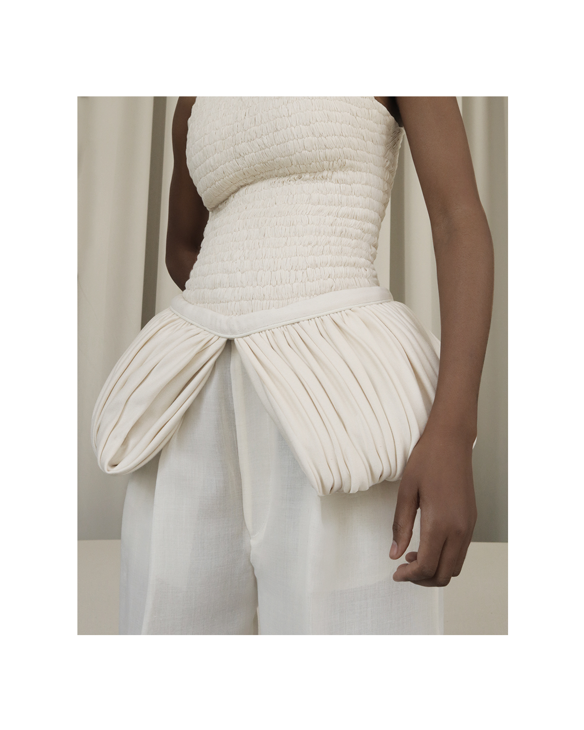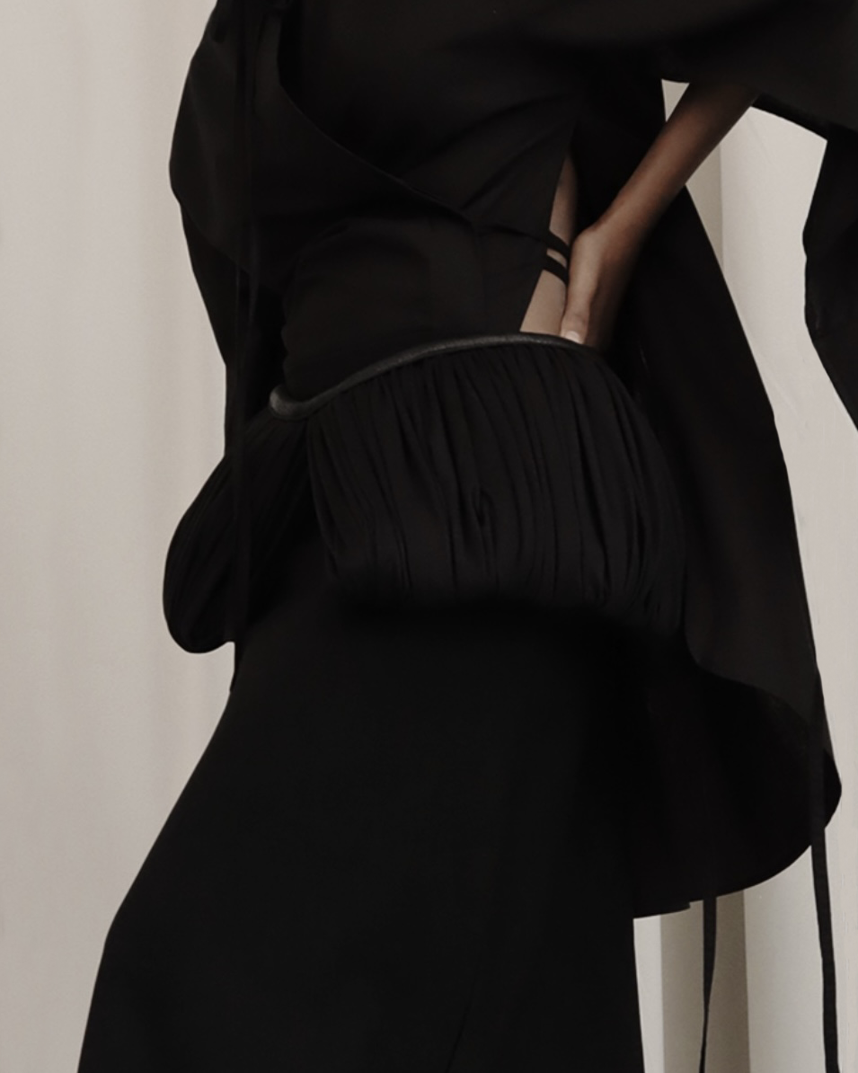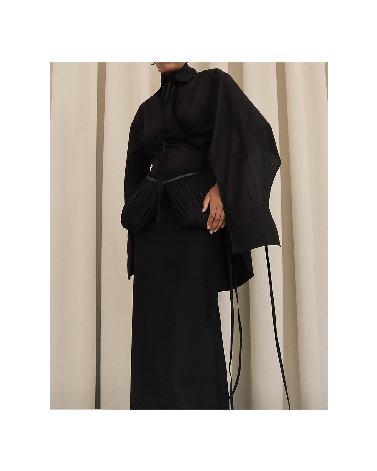The Doba Belt features an exaggerated, sculpted form with gathered folds that wrap and contour the waist. Designed as a wearable sculpture, it redefines proportion and adds dimensional contrast to any silhouette. A bold accent that transforms the ordinary into the unexpected.